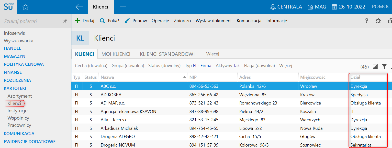 Programy linii InsERT nexo pozwalają na przypisanie przedstawicieli firm do różnych działów. Podział taki ułatwia odnalezienie danych wybranego przedstawiciela. Przykładowo, nazwa działu przedstawiciela może zostać wyświetlona w module Klienci, w kolumnie Dział.