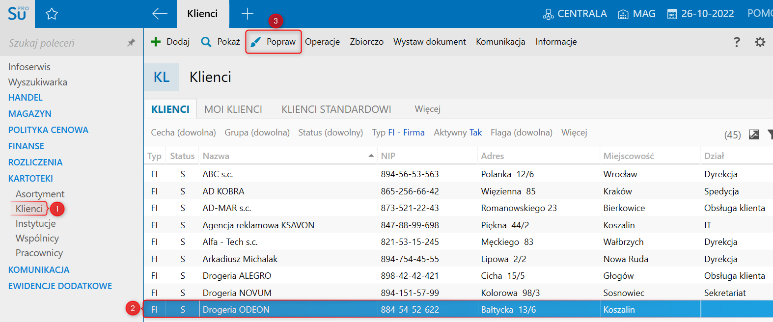 1. Przejść do modułu Klienci, zaznaczyć pozycję na liście i wybrać Popraw.
