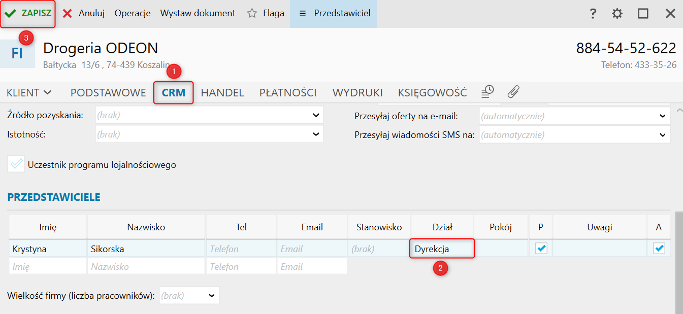 2. Na zakładce CRM, w sekcji Przedstawiciele, dla danego przedstawiciela wybrać Dział i zatwierdzić przyciskiem Zapisz.