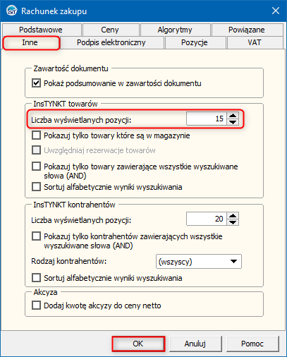 2. W oknie Rachunek zakupu przejść na zakładkę Inne i wybrać Liczbę wyświetlanych pozycji w sekcji InsTYNKT towarów. Zmiany zapisać przyciskiem OK.