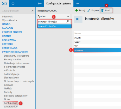 1. Przejść do Konfiguracji, odszukać i kliknąć Istotność klientów, zaznaczyć jedną lub wiele pozycji na liście i wybrać Usuń.