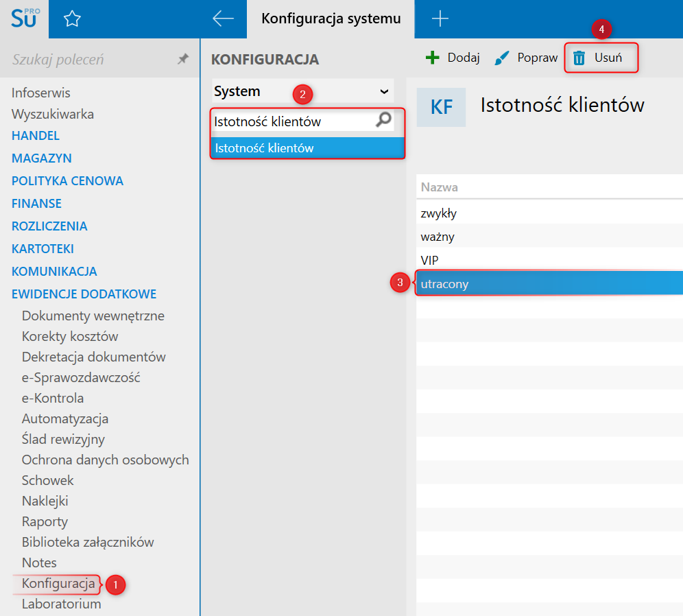 1. Przejść do Konfiguracji, odszukać i kliknąć Istotność klientów​, zaznaczyć jedną lub wiele pozycji na liście i wybrać Usuń.