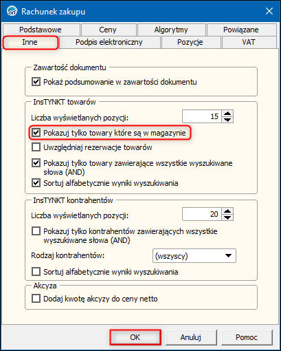 2. W oknie Rachunek zakupu przejść na zakładkę Inne i zaznaczyć opcję Pokazuj tylko towary, które są w magazynie w sekcji InsTYNKT towarów. Zmiany zapisać przyciskiem OK.