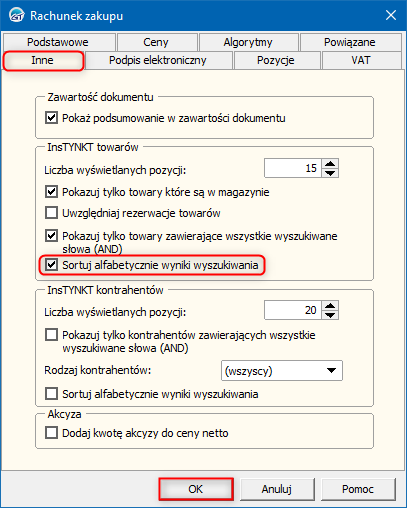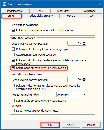 2. W oknie Rachunek zakupu przejść na zakładkę Inne i zaznaczyć opcję Sortuj alfabetycznie wyniki wyszukiwania w sekcji InsTYNKT towarów. Zmiany zapisać przyciskiem OK.