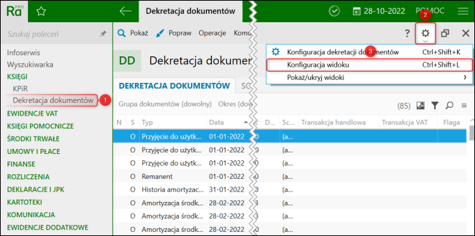 1. Przejść na zakładkę Dekretacji dokumentów, rozwinąć menu koła zębatego w górnym menu i wybrać Konfiguracja widoku.