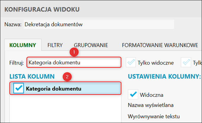 2. W polu Filtruj wpisać Kategoria dokumentu, zaznaczyć wyszukaną kolumnę na liście poniżej i zatwierdzić przyciskiem OK.