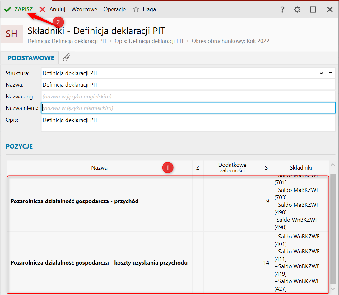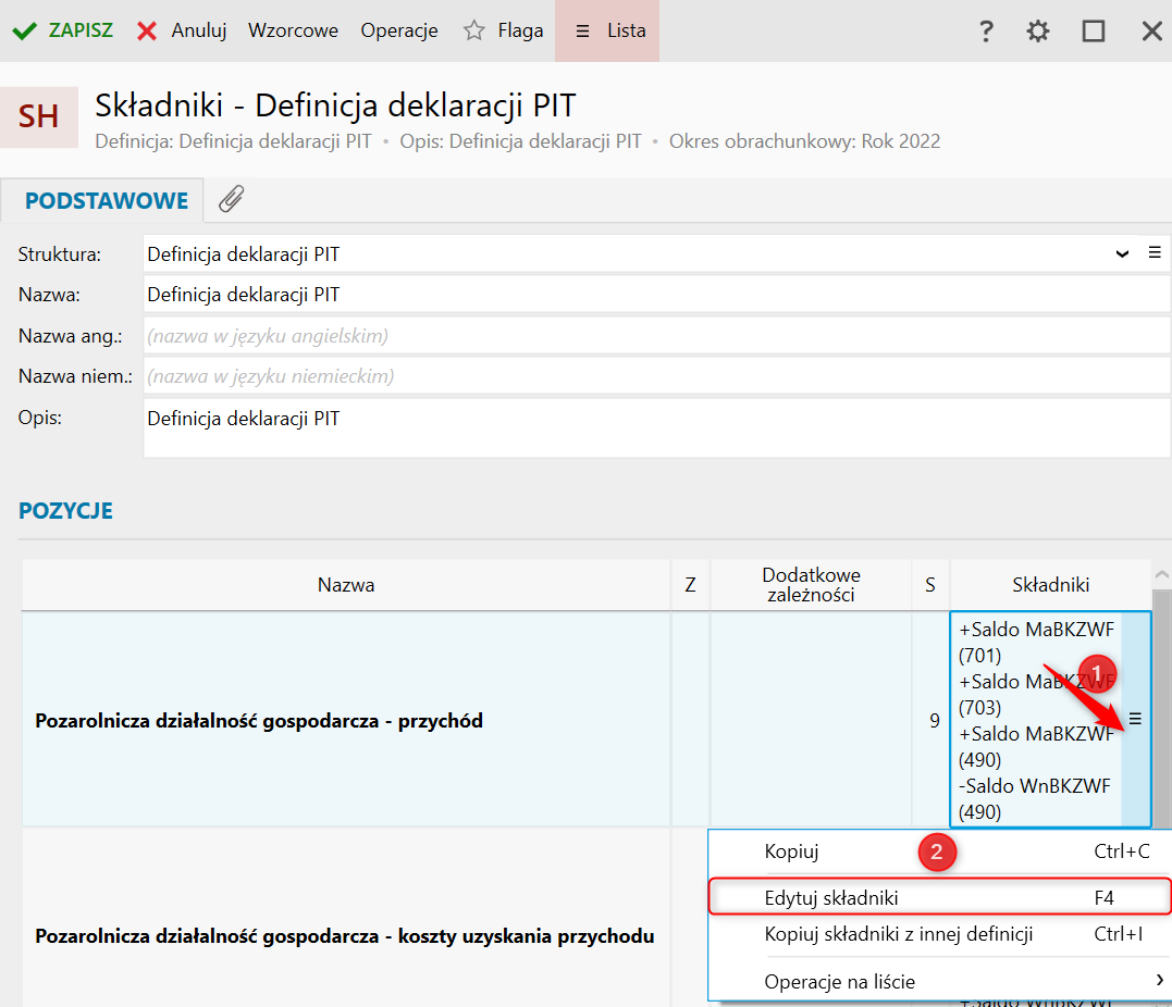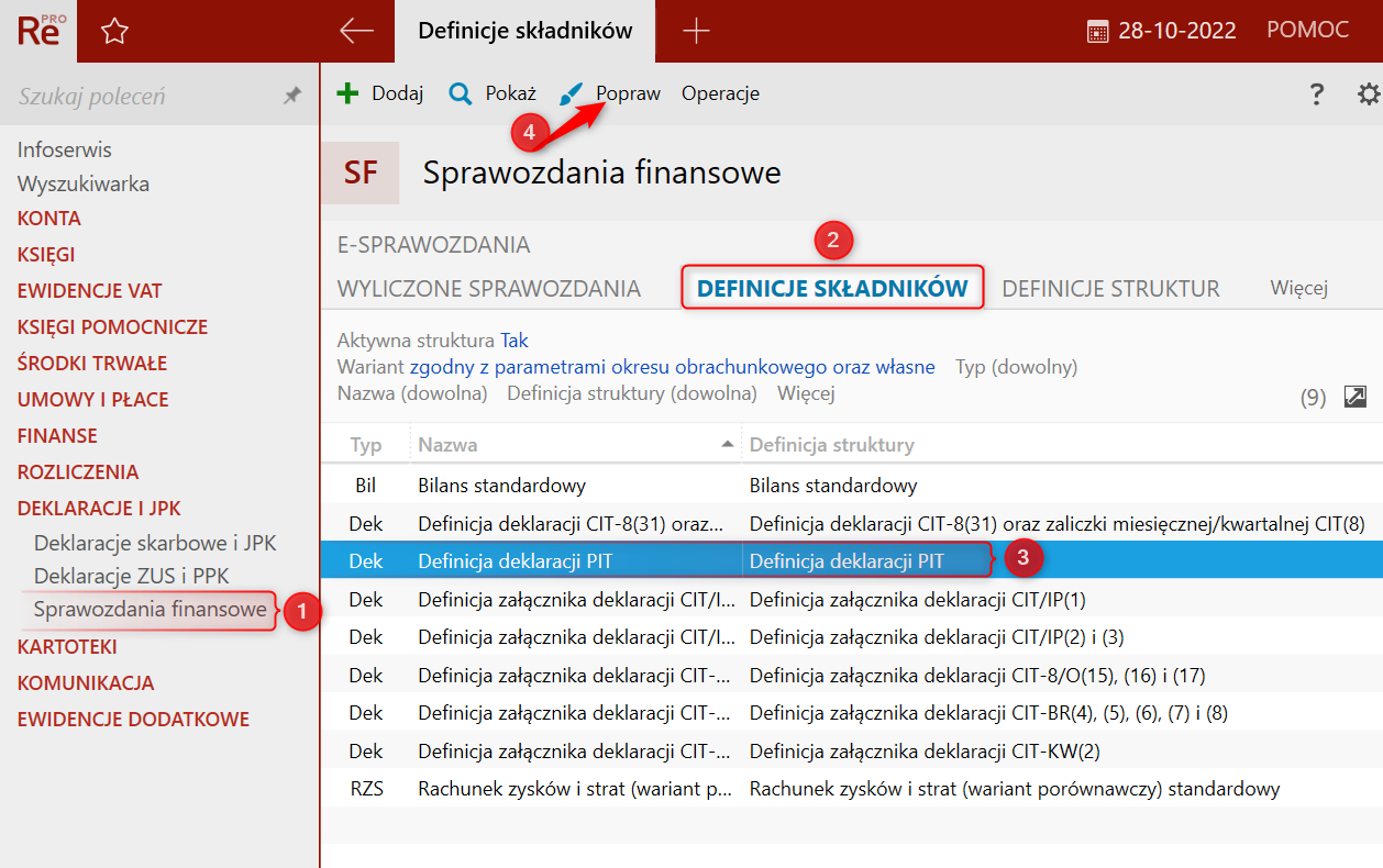 1. Przejść do modułu Sprawozdania finansowe – Definicje składników. Zaznaczyć Definicje deklaracji PIT i kliknąć Popraw.