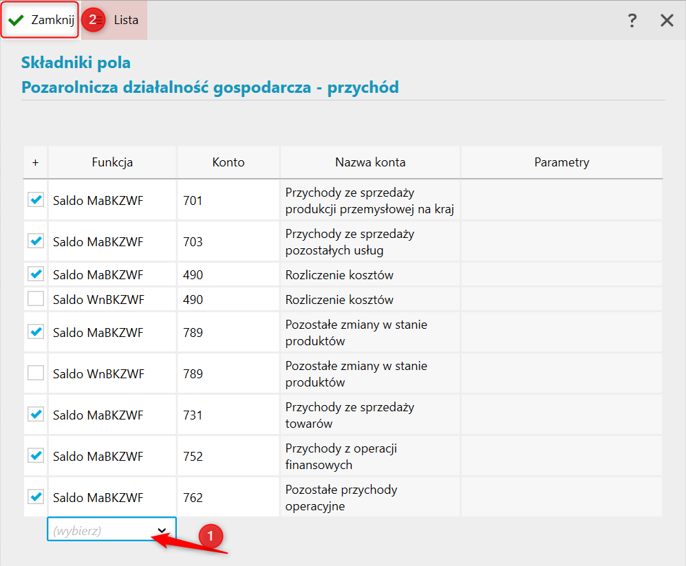 3. Dodać konta i ich funkcje według własnych preferencji, używając pola Wybierz.