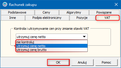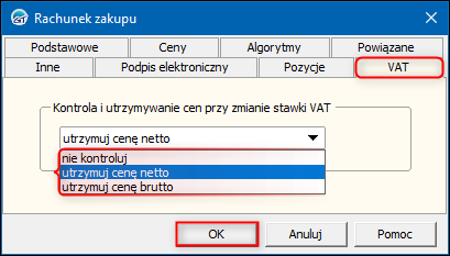 2. W oknie Rachunek zakupu przejść na zakładkę VAT i ustawić Kontrolę i utrzymywanie cen przy zmianie stawki VAT. Zmiany zapisać przyciskiem OK.