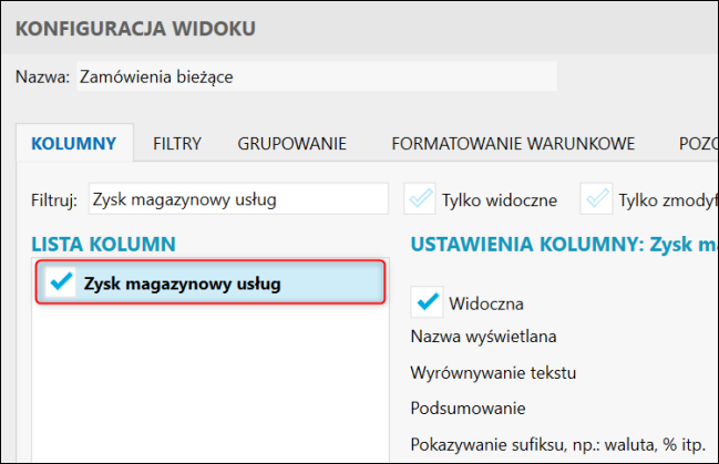 2. W polu Filtruj wpisać Zysk magazynowy usług, zaznaczyć wyszukaną kolumnę na liście poniżej i zatwierdzić przyciskiem OK.