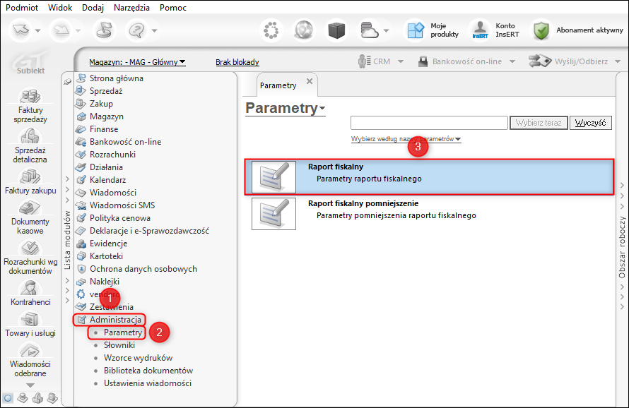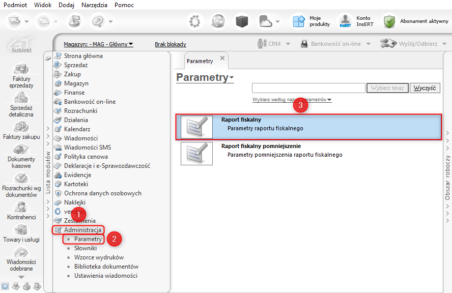 1. Z listy modułów wybrać Administracja – Parametry, a z listy parametrów Raport fiskalny.