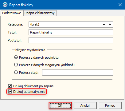 2. W oknie Raport fiskalny zaznaczyć opcję Drukuj automatycznie. Zmiany zapisać przyciskiem OK.