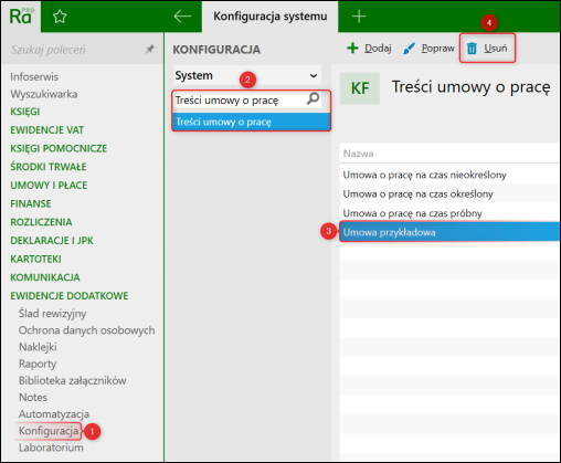 1. Przejść do modułu Konfiguracja, odszukać i kliknąć Treści umowy o pracę​, zaznaczyć pozycję na liście i wybrać Usuń.