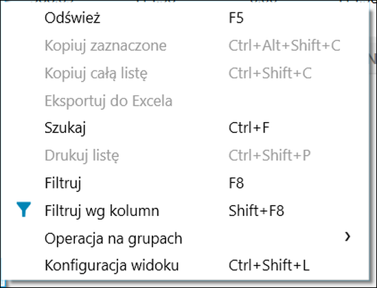 W wersji 42.0.0 systemu InsERT nexo dodane zostało uprawnienie, które blokuje niektóre rodzaje eksportu, w tym także wydruk listy. Użytkownik bez niego zobaczy nieaktywne opcje:
