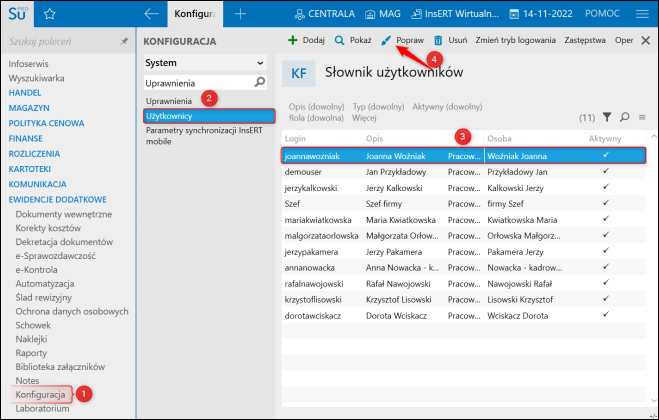 1. Przejść do modułu Ewidencje dodatkowe – Konfiguracja – Użytkownicy, zaznaczyć wybranego pracownika i z górnego menu kliknąć Popraw.