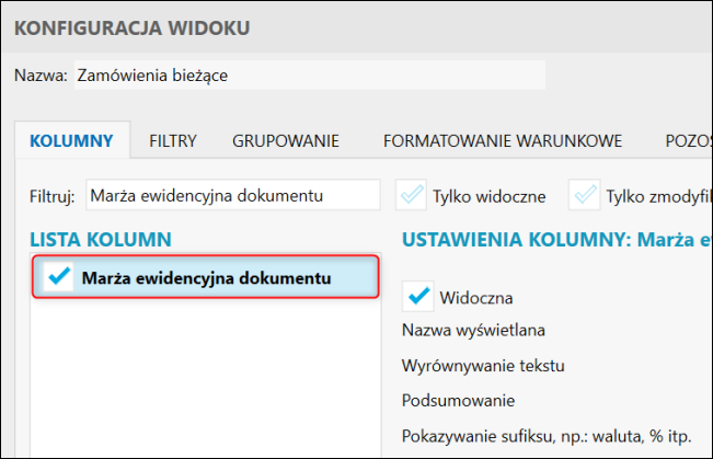 2. W polu Filtruj wpisać Marża ewidencyjna dokumentu, zaznaczyć wyszukaną kolumnę na liście poniżej i zatwierdzić przyciskiem OK.