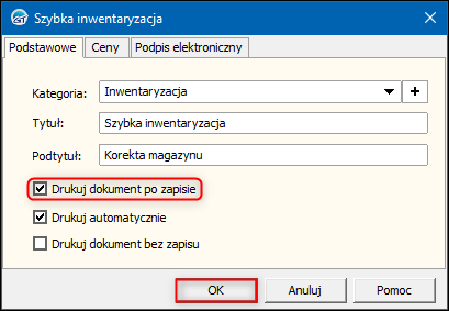 2. W oknie, które się wyświetli zaznaczyć opcję Drukuj dokument po zapisie. Zmiany zapisać przyciskiem OK.