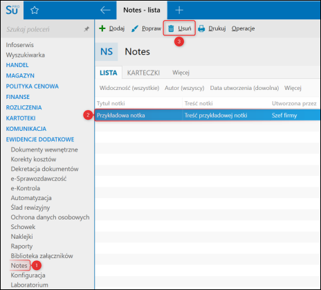 1. Przejść do modułu Notes, zaznaczyć jedną lub wiele pozycji na liście i kliknąć Usuń.