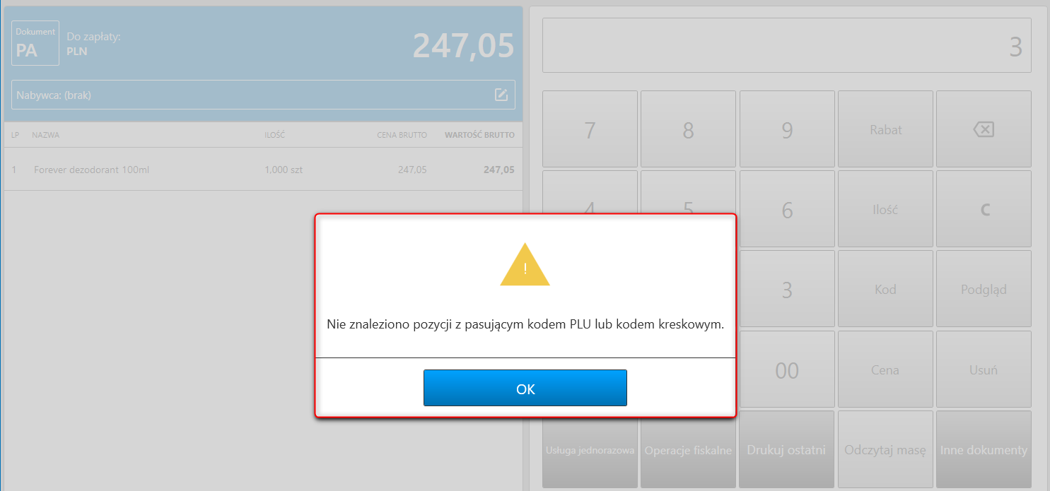 Jeżeli program nie znajdzie pozycji o wskazanym kodzie PLU lub kodzie kreskowym, to operacja zostanie przerwana.