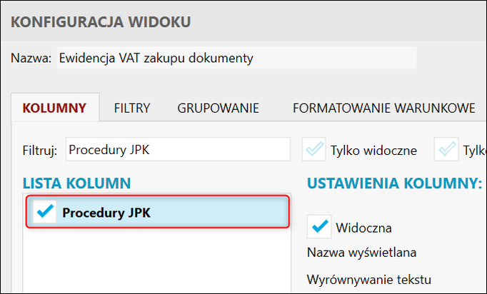 Aby pokazać kolumnę Procedury JPK, należy: