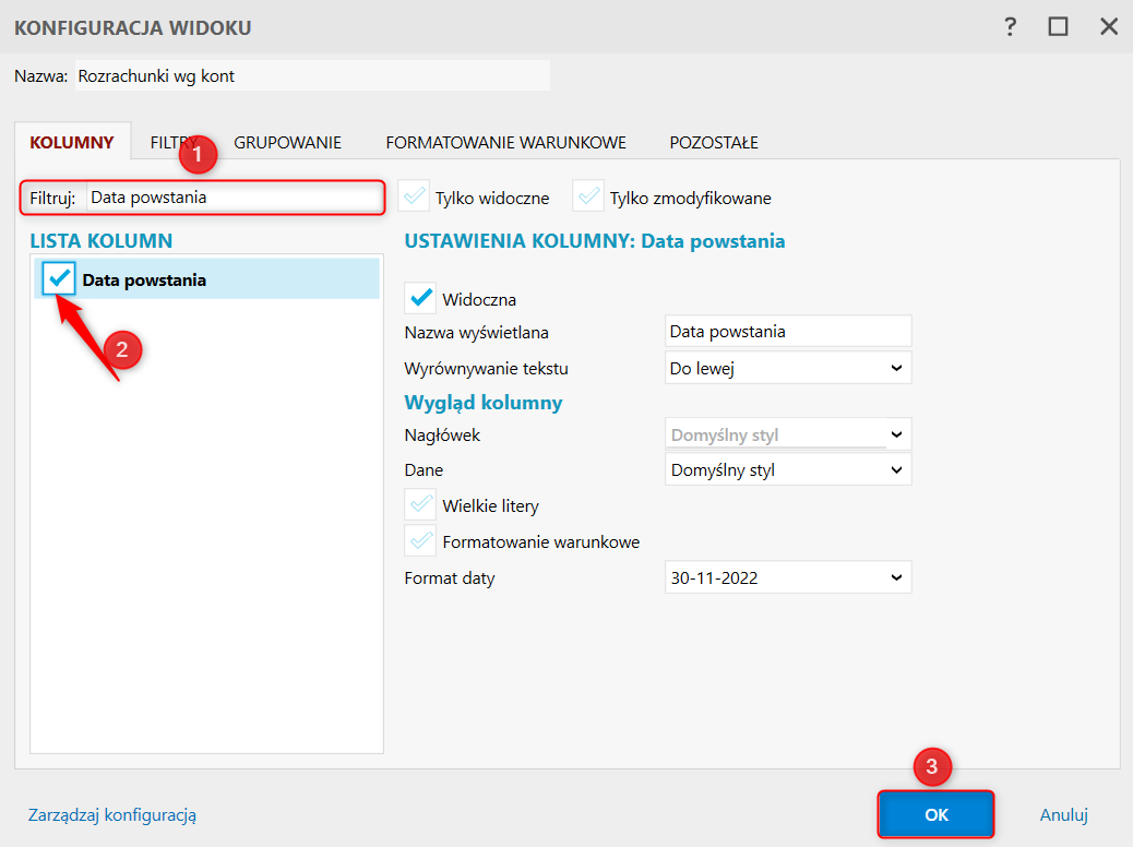 2. Odnaleźć i włączyć kolumnę Data powstania. Zapisać zmiany.
