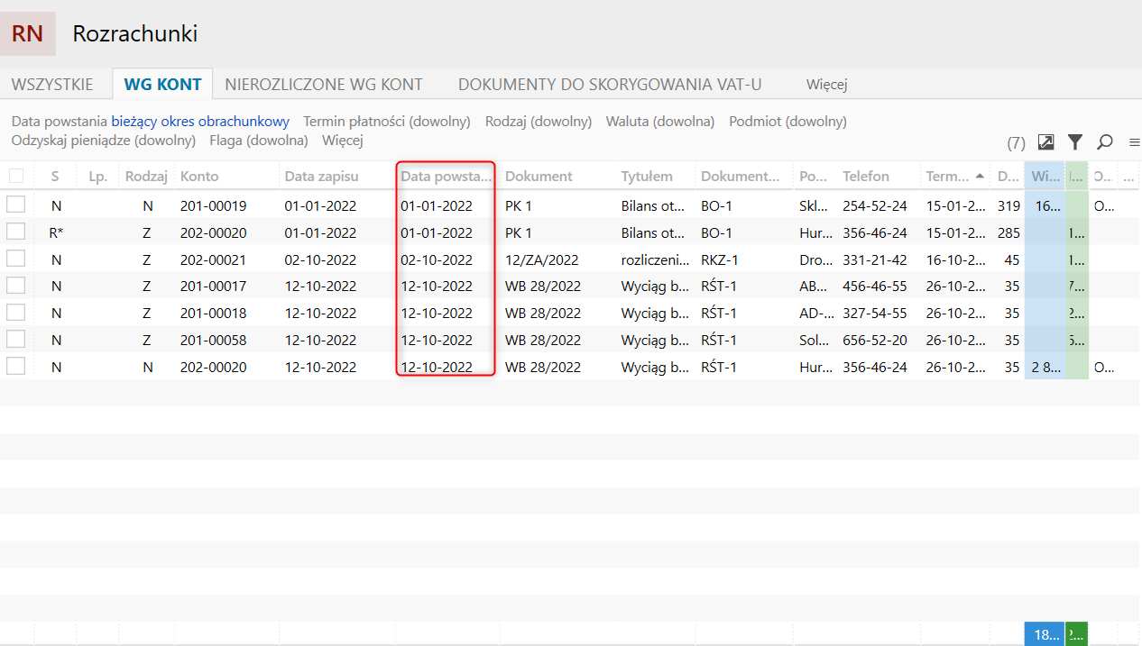 W widoku Rozrachunki wg kont wyświetli się kolumna prezentująca Datę powstania rozrachunku.