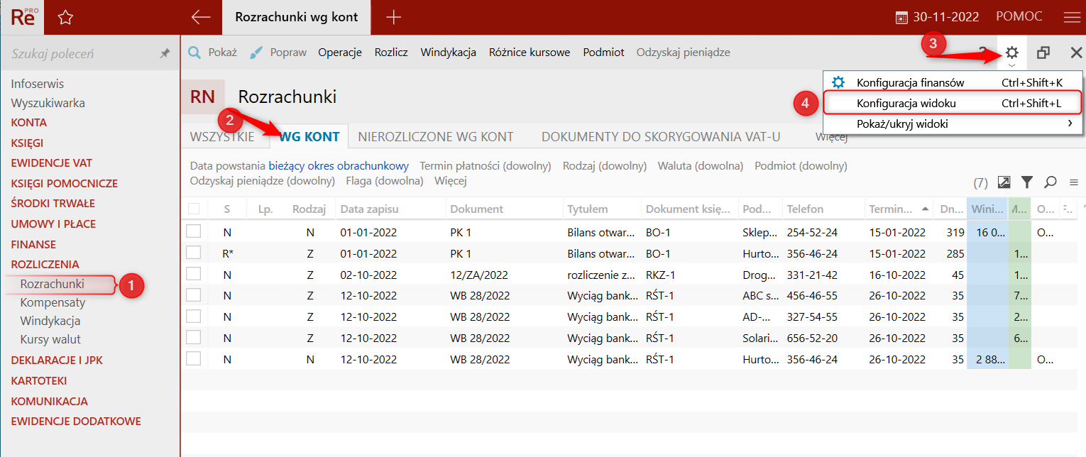 1. Przejść do modułu Rozrachunki na zakładkę Wg kont, kliknąć „zębatkę" znajdującą się w prawym górnym rogu, następnie wybrać Konfiguracja widoku.