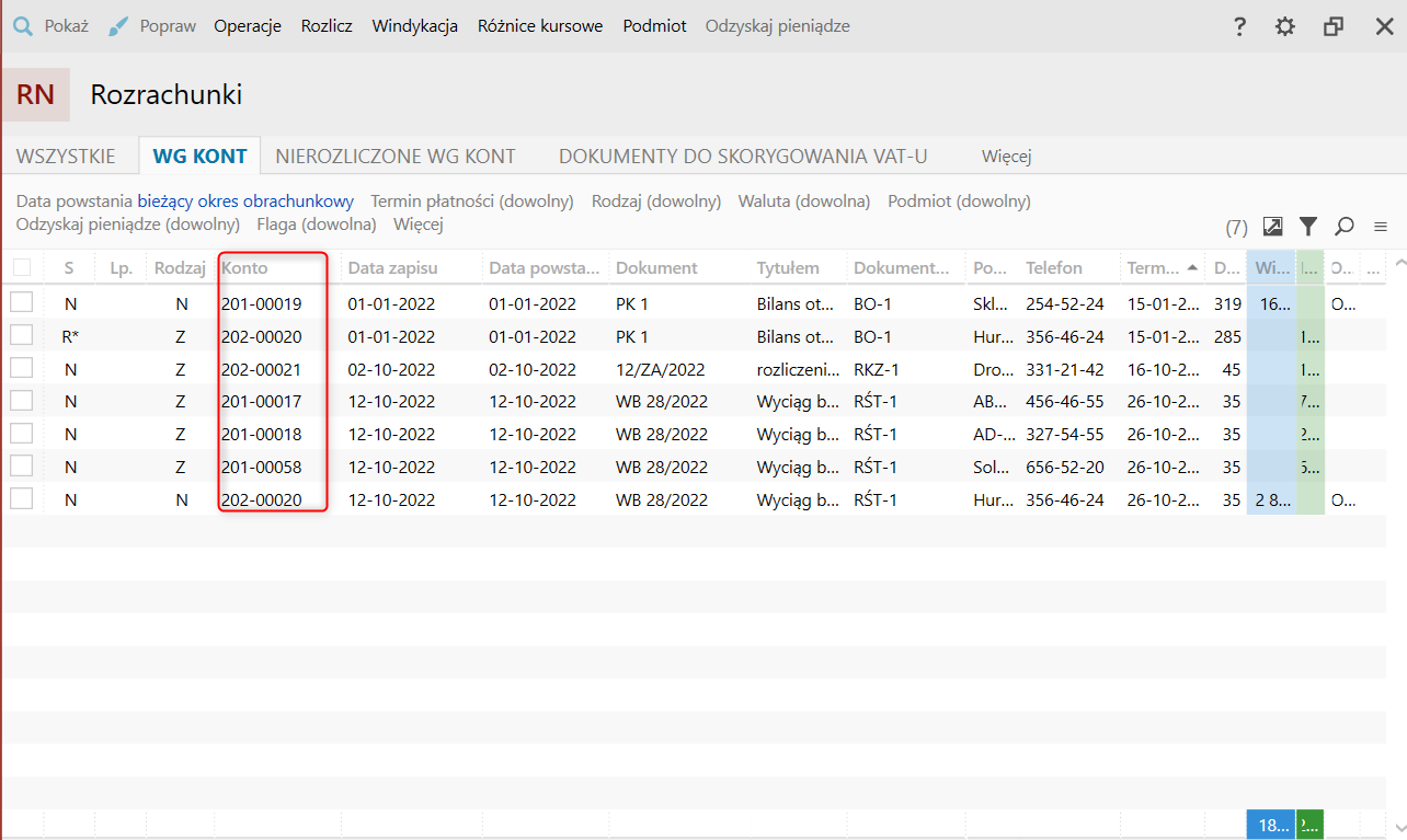 W widoku Rozrachunki wg kont wyświetli się kolumna prezentująca Konto, na którym zadekretowany jest rozrachunek.