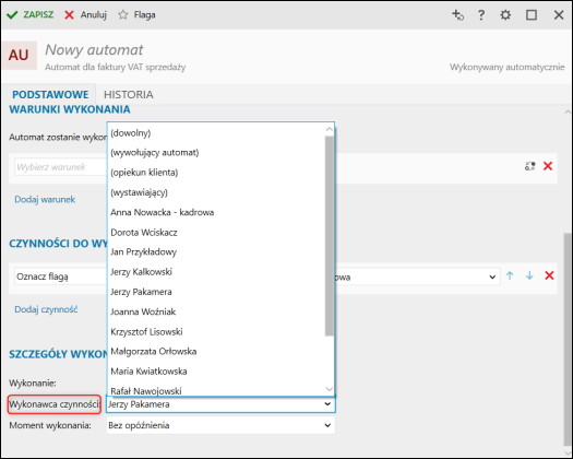 Użytkownik – wykonawcą automatu może być wskazany użytkownik programu, a dla obiektów, które posiadają klienta, można wskazać opiekuna klienta.