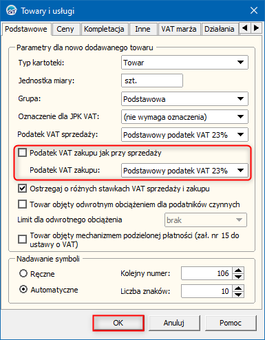 2. W oknie, które się wyświetli wyłączyć opcję Podatek VAT zakupu jak przy sprzedaży i wybrać domyślny Podatek VAT zakupu. Zmiany zapisać przyciskiem OK.