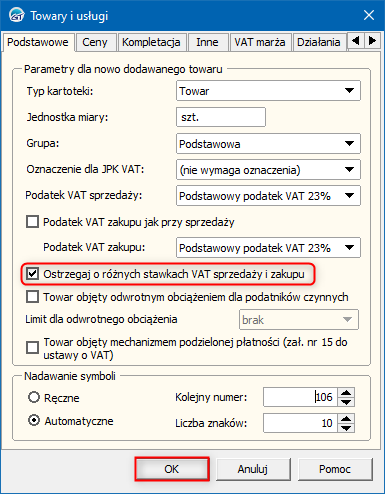 2. W oknie, które się wyświetli zaznaczyć opcję Ostrzegaj o różnych stawkach VAT sprzedaży i zakupu. Zmiany zapisać przyciskiem OK.