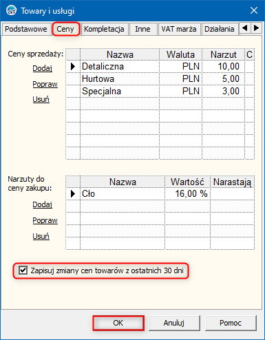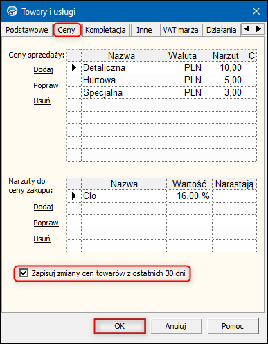 2. W oknie, które się wyświetli przejść na zakładkę Ceny i zaznaczyć opcję Zapisuj zmiany cen towarów z ostatnich 30 dni. Zmiany zapisać przyciskiem OK.
