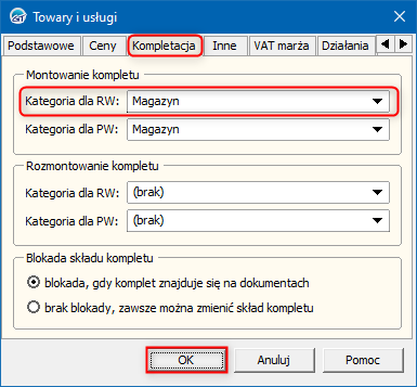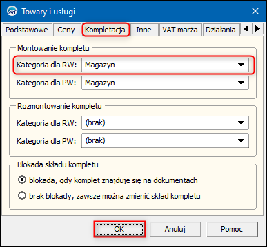 2. W oknie, które się wyświetli przejść na zakładkę Kompletacja i wybrać domyślną Kategorię dla RW w sekcji Montowanie kompletu. Zmiany zapisać przyciskiem OK.