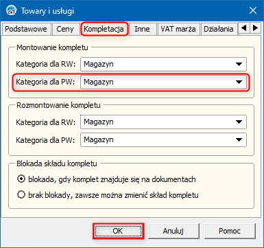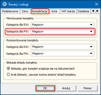 2. W oknie, które się wyświetli przejść na zakładkę Kompletacja i wybrać domyślną Kategorię dla PW w sekcji Montowanie kompletu. Zmiany zapisać przyciskiem OK.