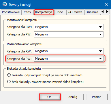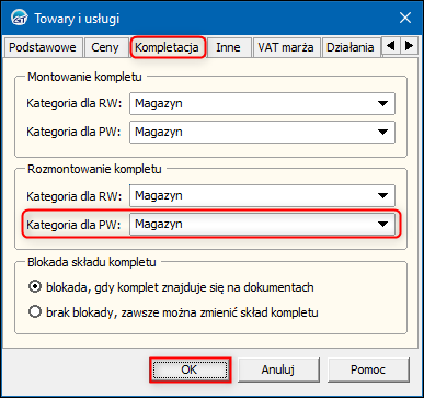 2. W oknie, które się wyświetli przejść na zakładkę Kompletacja i wybrać domyślną Kategorię dla PW w sekcji Rozmontowanie kompletu. Zmiany zapisać przyciskiem OK.