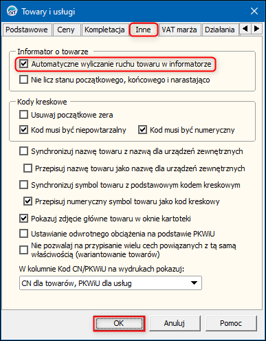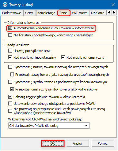 2. W oknie, które się wyświetli przejść na zakładkę Inne i zaznaczyć opcję Automatyczne wyliczanie ruchu towaru w informatorze w sekcji Informator o towarze. Zmiany zapisać przyciskiem OK.