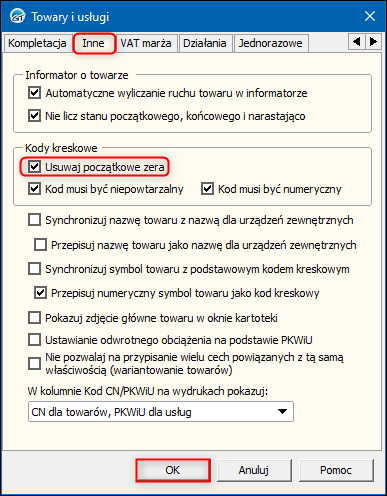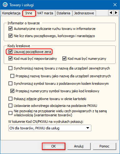2. W oknie, które się wyświetli przejść na zakładkę Inne i zaznaczyć opcję Usuwaj początkowe zera. Zmiany zapisać przyciskiem OK.