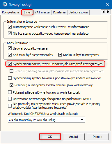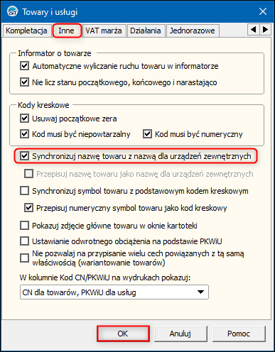 2. W oknie, które się wyświetli przejść na zakładkę Inne i zaznaczyć opcję Synchronizuj nazwę towaru z nazwą dla urządzeń zewnętrznych. Zmiany zapisać przyciskiem OK.