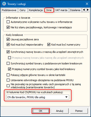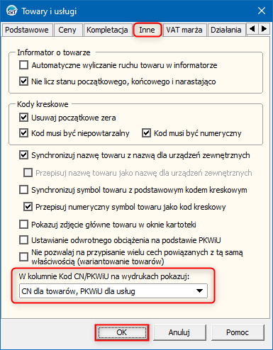 2. W oknie, które się wyświetli przejść na zakładkę Inne i wybrać odpowiednią opcję w polu W kolumnie Kod CN/PKWiU na wydrukach pokazuj. Zmiany zapisać przyciskiem OK.