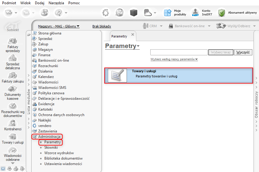1. Z listy modułów wybrać Administracja – Parametry, a z listy parametrów Towary i usługi.