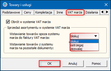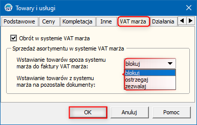 - blokuj – program uniemożliwi wstawanie towarów bez oznaczenia w kartotece Obrót w systemie VAT marża na fakturę VAT marża