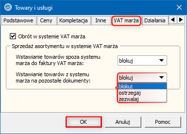 blokuj – program uniemożliwi wstawianie towarów, które mają w kartotece zaznaczony obrót w systemie VAT marża na inne dokumenty