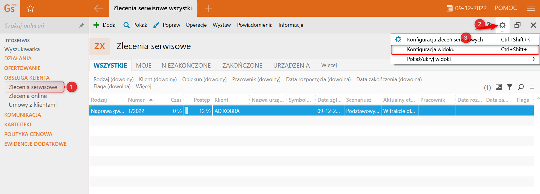 1. Przejść do modułu Obsługa klienta – Zlecenia serwisowe, kliknąć zębatkę w prawym górnym rogu, następnie Konfiguracja widoku.
