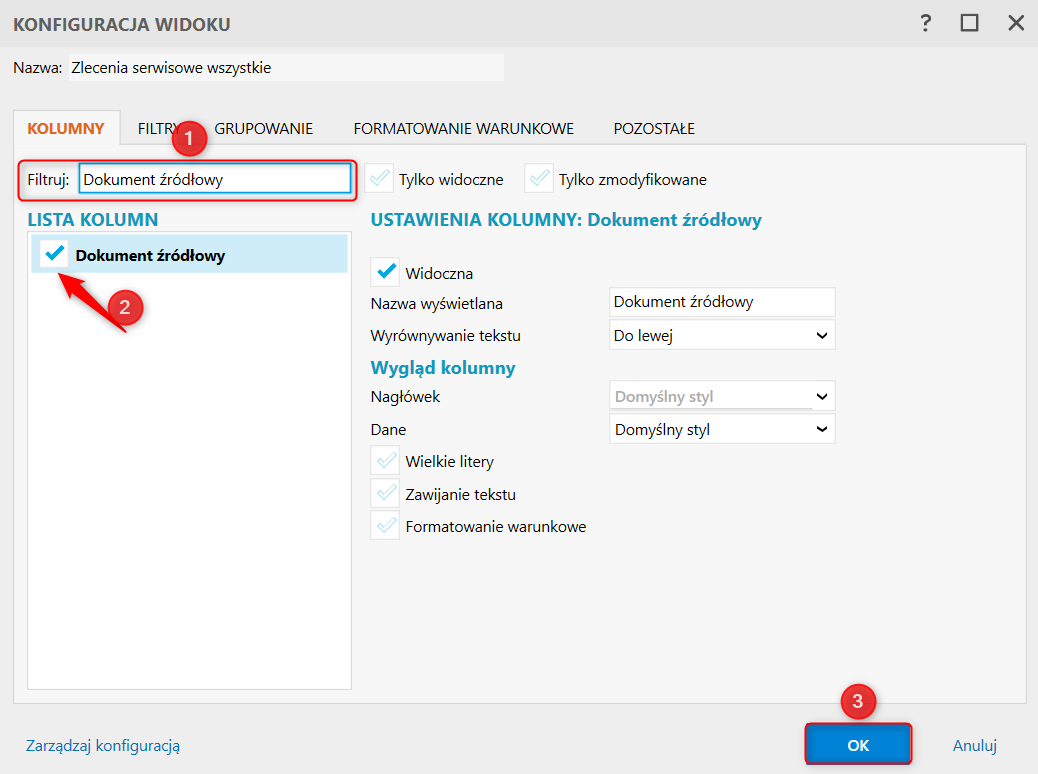 2. Z listy kolumn wybrać Dokument źródłowy i zatwierdzić przyciskiem OK.