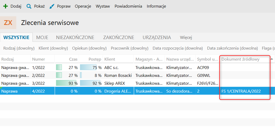 W module Zlecenia serwisowe wyświetli się kolumna z numerem Dokumentu źródłowego.