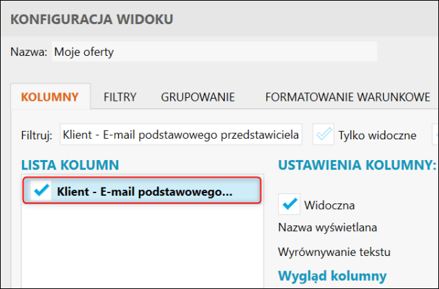 Gestor nexo – Jak do widoku Ofert dodać kolumnę Klient – E-mail podstawowego przedstawiciela?