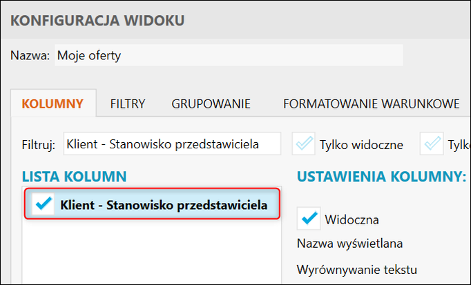 Gestor nexo – Jak do widoku Ofert dodać kolumnę Klient – Stanowisko przedstawiciela?