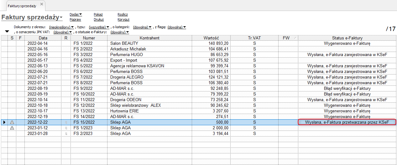 Na liście dokumentów w kolumnie status e-Faktury wyświetli się stosowny status.