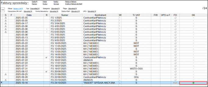 Na liście dokumentów w kolumnie status e-Faktury wyświetli się stosowny status.