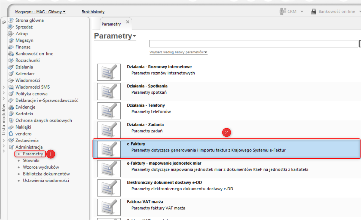 1. Przejść do modułu Administracja – Parametry. Z listy parametrów wybrać e-Faktury.